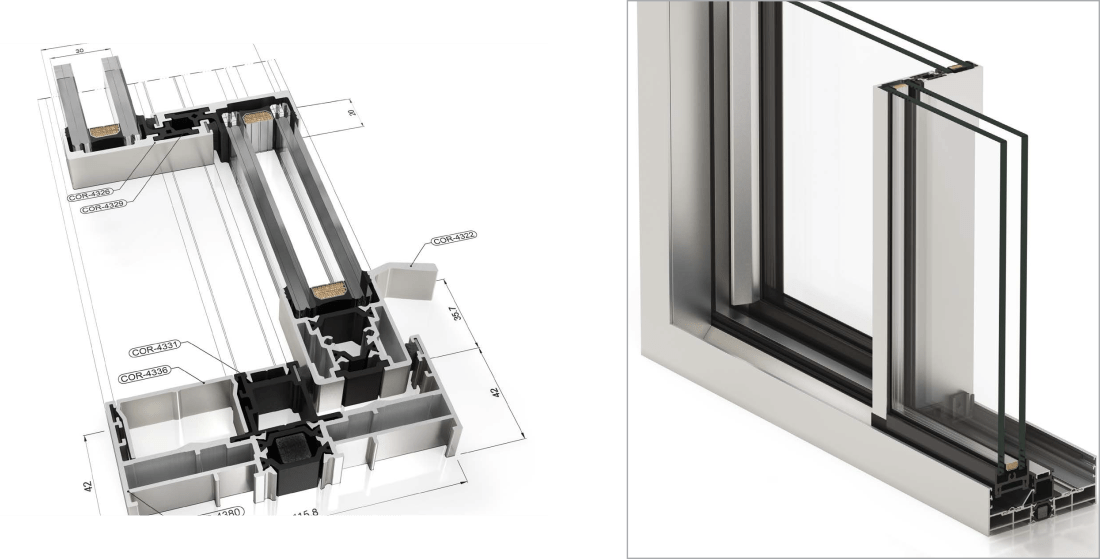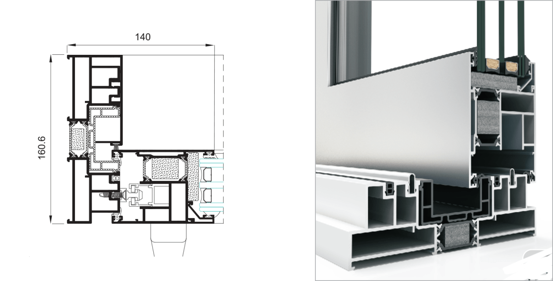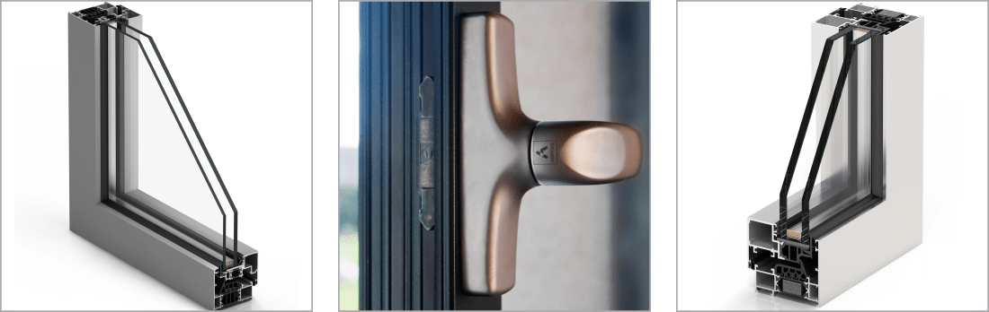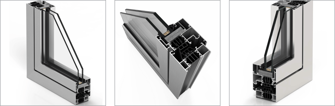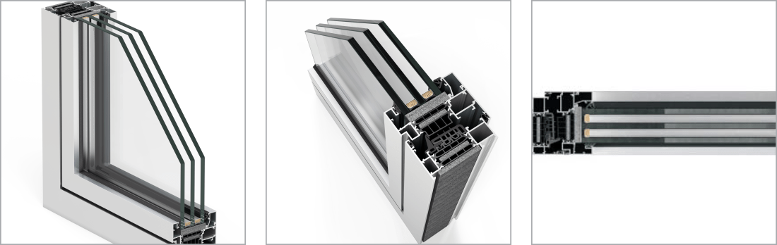 Questa massima efficienza energetica è possibile grazie al giunzione perfetto nella zona di rottura termica con poliammidi di 35 e 24 mm, dei profili PE reticolari e dell’alta capacità di vetrata presente nelle lastre, che permettono lo spessore del vetro di 55 mm, fornendo la possibilità di installare delle composizioni a doppia camera e triple vetro, per garantire l’eccezionale isolamento termico e per migliorare, in particolare, la protezione contro il rumore.
