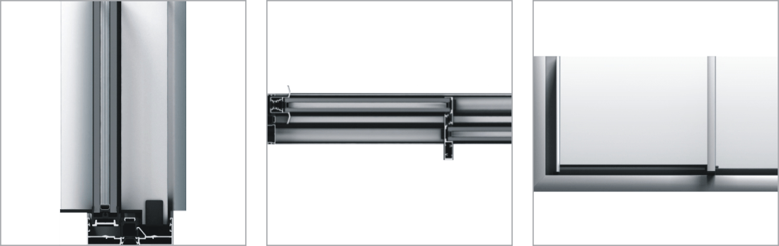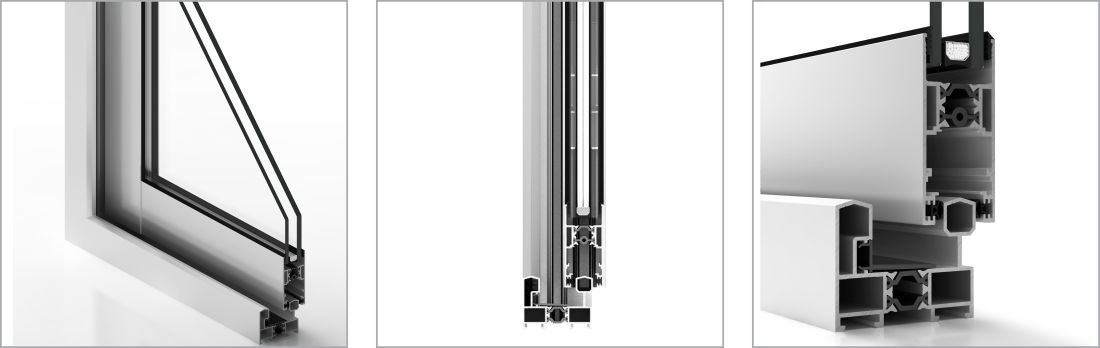Sezioni: telaio – 60, 65, 77 e 80 mm oppure 106 e 126 mm (telaio a 3 vie di scorrimento), stipite – 33 e 37 mm
