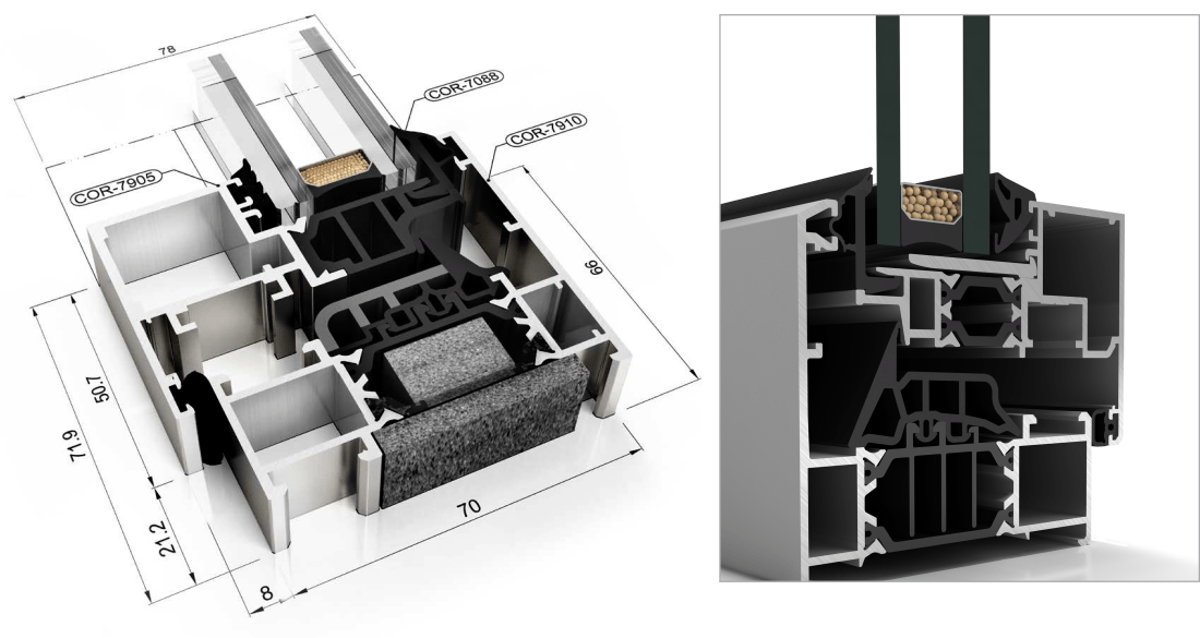 Sistema di finestra ai cardini di 70 mm, con alta capacità d’isolamento, un coefficiente di scambio termico del telaio di soli 0,8 W/m²K ottenuto grazie alla perfetta giunzione ed al design dei profili di alluminio, alle barre tubolari di poliammide di 35 mm, le alle guarnizioni tubolari di tenuta stagna E.P.D.M. e a un sistema di schiuma poliolefine fissata perimetralmente sul profilo di supporto del vetro.